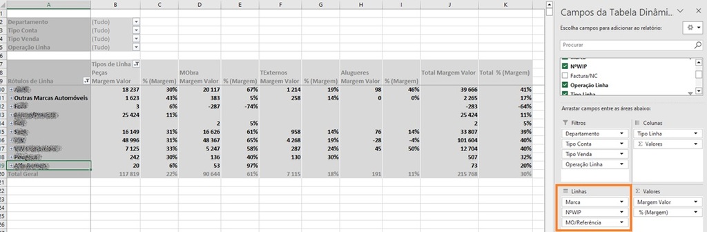 Margem Wips – Margens geradas nas Wips linha a linha agrupadas por Wip e Marca (Marca -> Wip -> Linha):